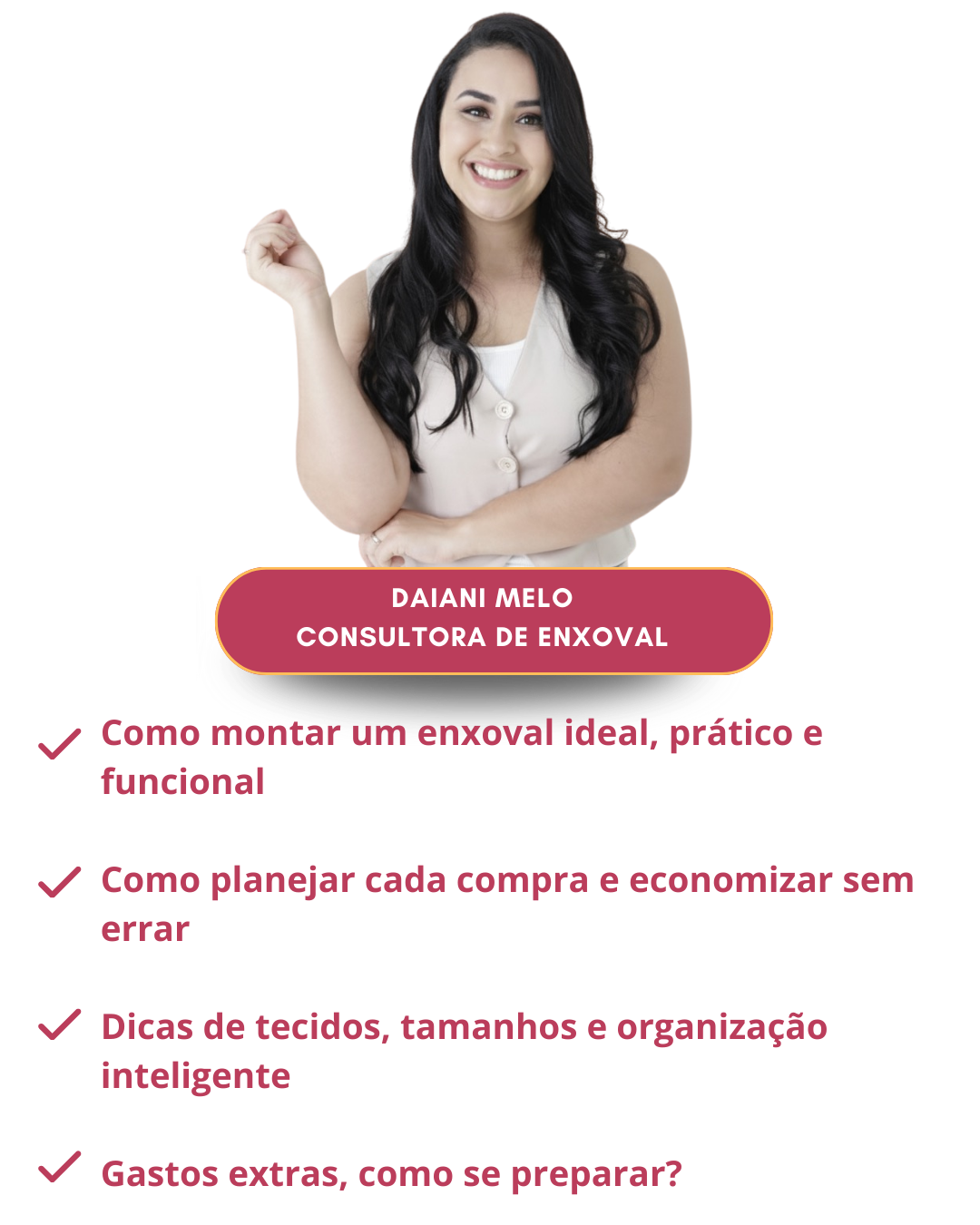 Sou consultora de enxoval, mãe de três e assim como você já fui tentante, gestante e passei pelo desafio do puerpério. Criadora do método Enxoval com Propósito e a idealizadora do Maternar Experience.